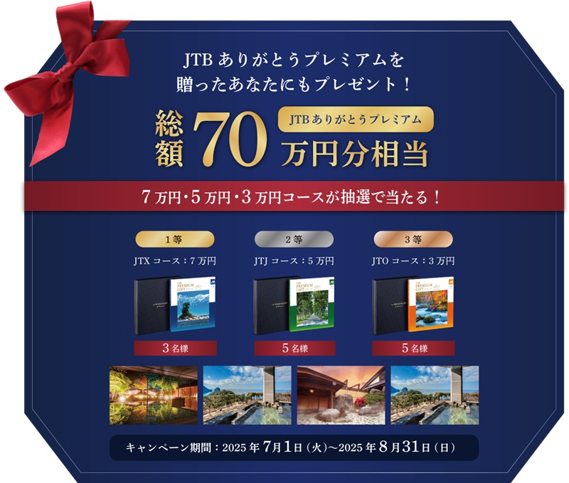 総額70万円で、JTXコース、JTJコース、JTOコースが、贈った方にも抽選で当たります。